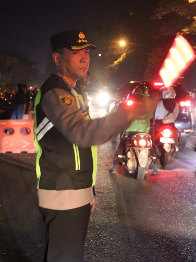 Untuk mengurai kemacetan tampak petugas Kepolisian Polresta Pontianak bekerja ektra mengatur pengendara yang melinras dijalan Sutan Syahrir hingga kota baru.Minggu (21/5/2023).