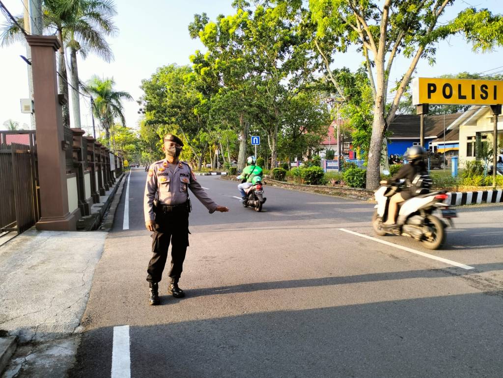 Tampak pagi ini anggota Satuan Samapta Pontianak memulai pelaksanaan Strongpoint pagi disepanjang jl.Johan Idrus hingga jl. M.Sohor.