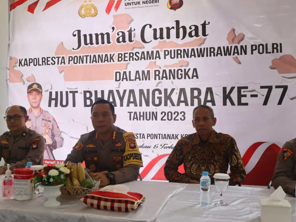 Pontianak,Polda Kalbar – Gelar kegiatan Jum’at Curhat bersama purnawirawan Polri sekota Pontianak,Kapolresta Pontianak minta agar purnawirawan Polri turut berperan aktif dimasyarakat untuk membangun citra Polri yang lebih baik dan dapat kepercayaan masyarakat semakin tinggi terhadap Polri.