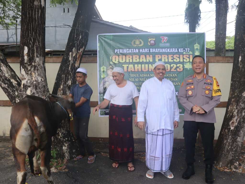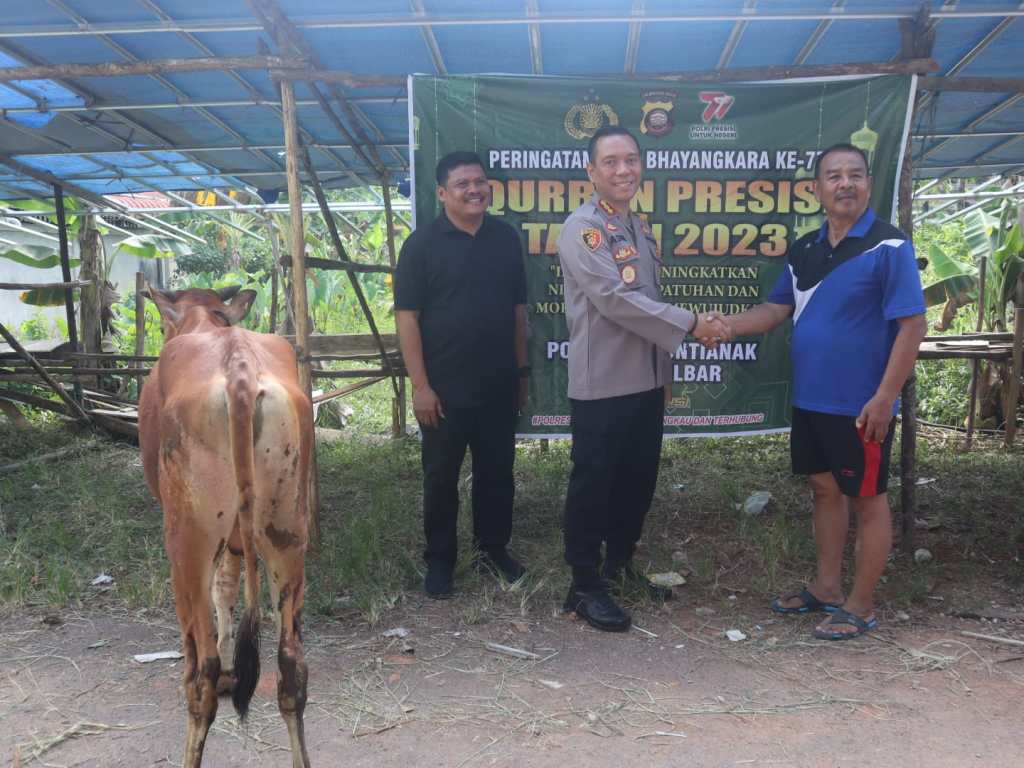 Pontianak,Polda Kalbar – Sedikitnya 7 ekor sapi dan 13 ekor kambing hasil pengumpulan panitia kurban Idul adha tahun 2023 Polresta Pontianak telah disalurkan langsung oleh Kapolresta Pontianak ke sejumlah pengurus masjid,pondok pesantren,panti asuhan dan tokoh masyarat,Kamis (29/6/2023) pagi.
