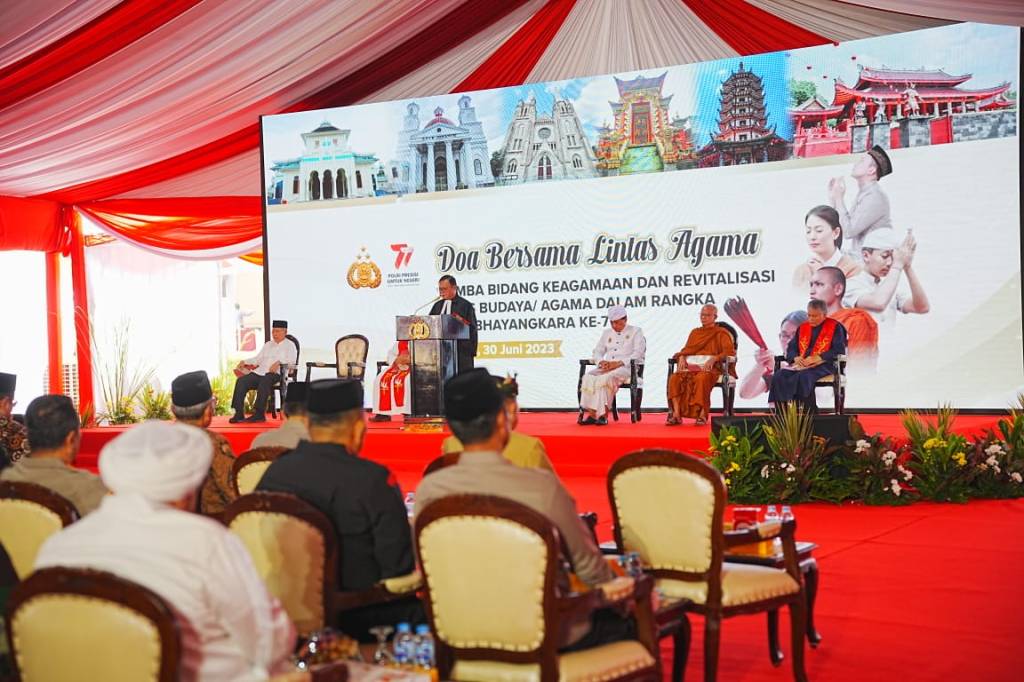 Jakarta – Kepolisian Negara Republik Indonesia (Polri) menggelar doa bersama dalam rangka Hari Bhayangkara ke-77 di Lapangan Bhayangkara Jakarta, Jumat (30/6/2023).
