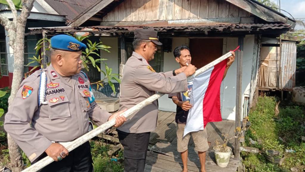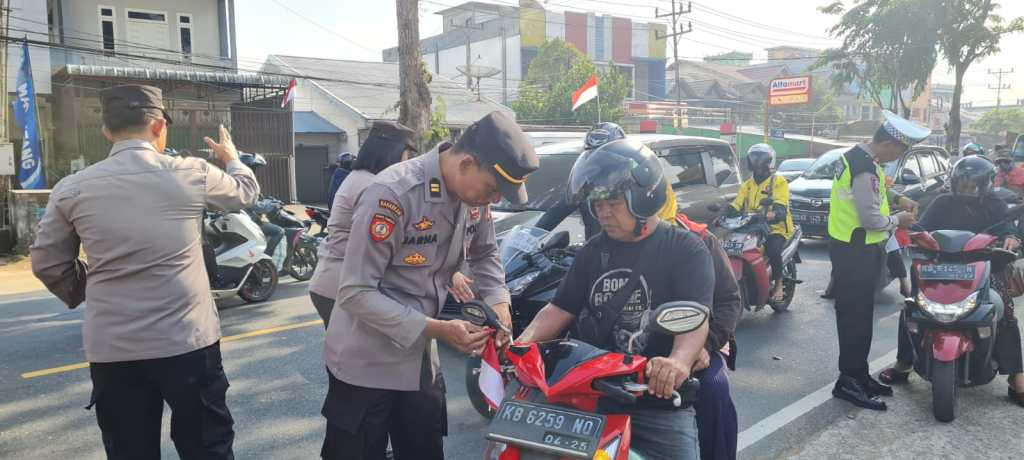 Tampak Kapolsek bersama personel menghentikan pengendara motor dan mobil yang melintas dilokasi dan memasangkan bendera merah putih ukuran kecil pada kendaraan tersebut,selain itu kegiatan dilanjutkan membagikan bendera yang berukuran besar kepada sejumlah warga yang belum memasang bendera dihalaman rumahnya.