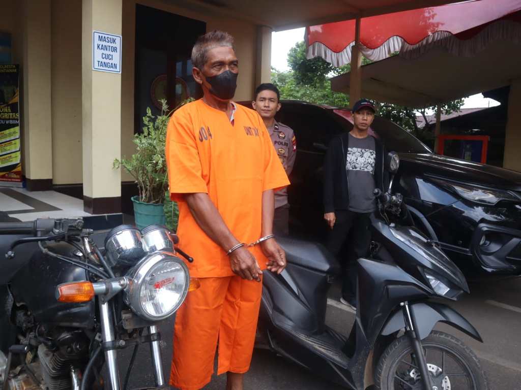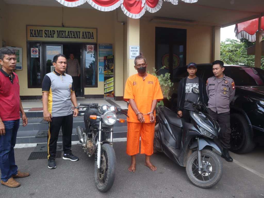 Pelaku S (57) diamankan bersama barang bukti satu unit sepeda motor hasil kejahatannya dan satu unit sepeda motor milik pelaku sebagai sarana melakukan aksinya.