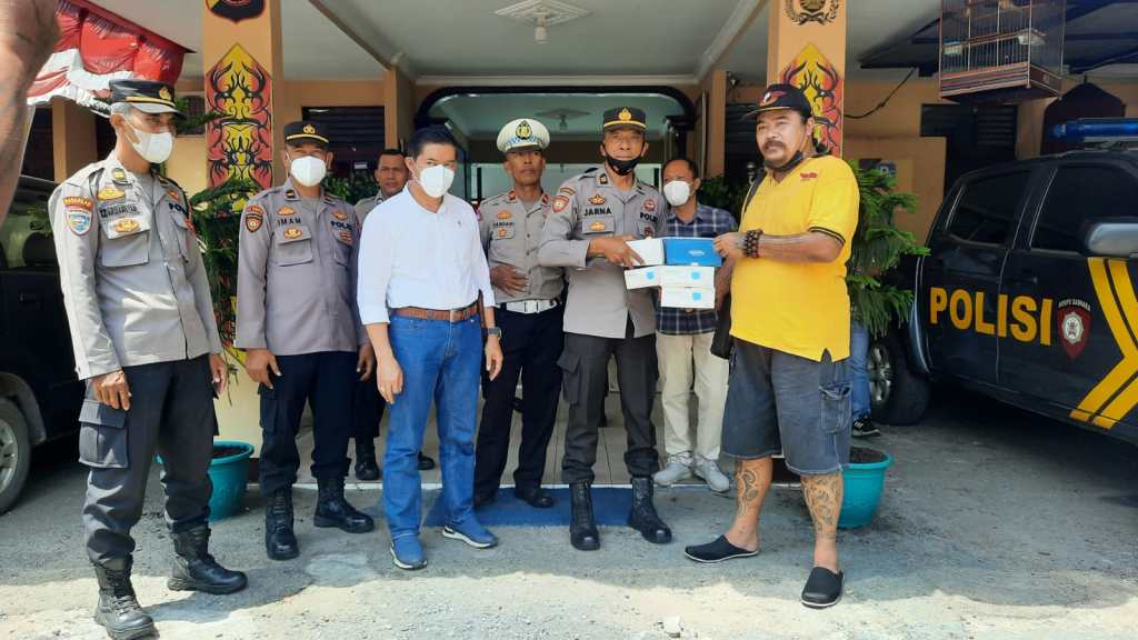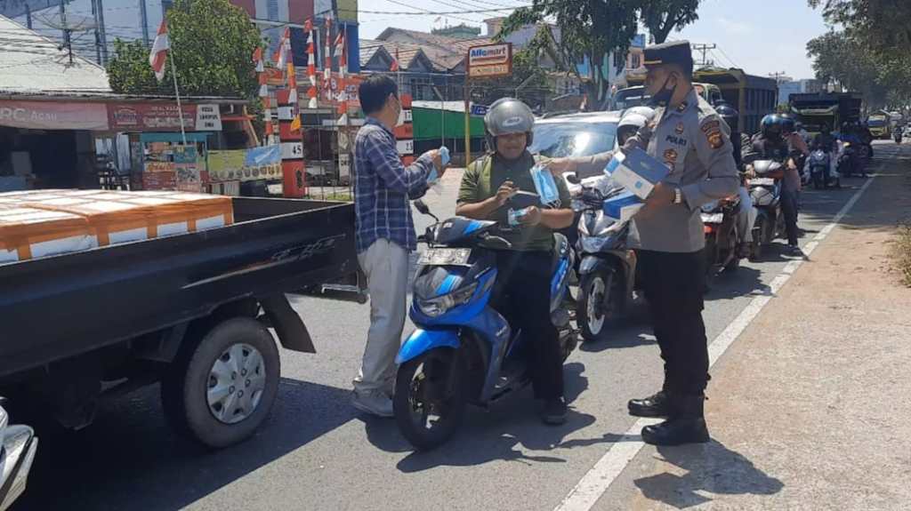 Para pengendara roda dua dan empat yang melintasi di depan Mako Polsek mendapatkan masker gratis yang dibagikan tersebut.