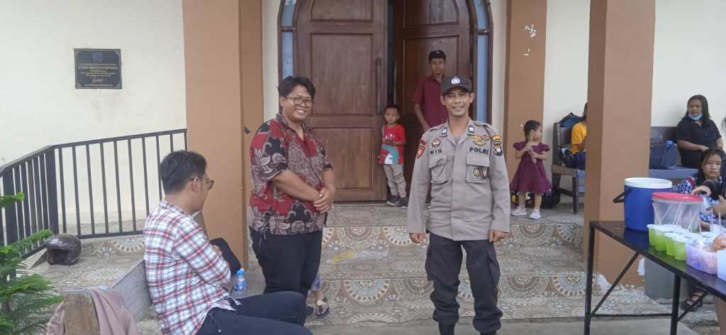 PONTIANAK, KALBAR – Personil Polsek Pontianak Timur Aiptu Winarno beserta Anggotanya melaksanakan Kegiatan Rutin Yang Ditingkatkan dengan melaksanakan pengamanan jemaah ibadah Minggu secara rutin. Minggu (18/09/2023).