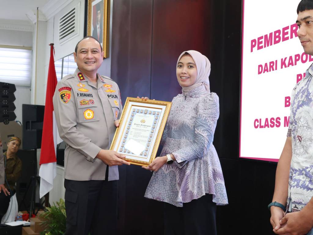 Pontianak, Polda Kalbar – Kapolda Kalbar Irjen Pol Pipit Rismanto, S.IK., M.H., memberikan penghargaan Kepada 2 orang atlet kalbar yang berhasil meraih juara pada Tour Of Kemala Banyuwangi 2023 di ruang Aula Graha Kathulistiwa Polda Kalbar pada hari Kamis (12/10).