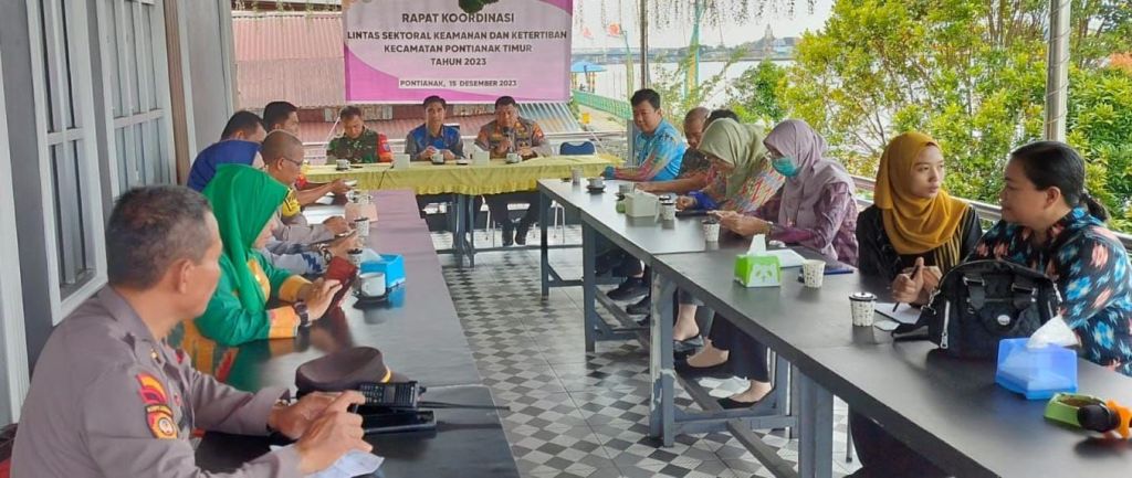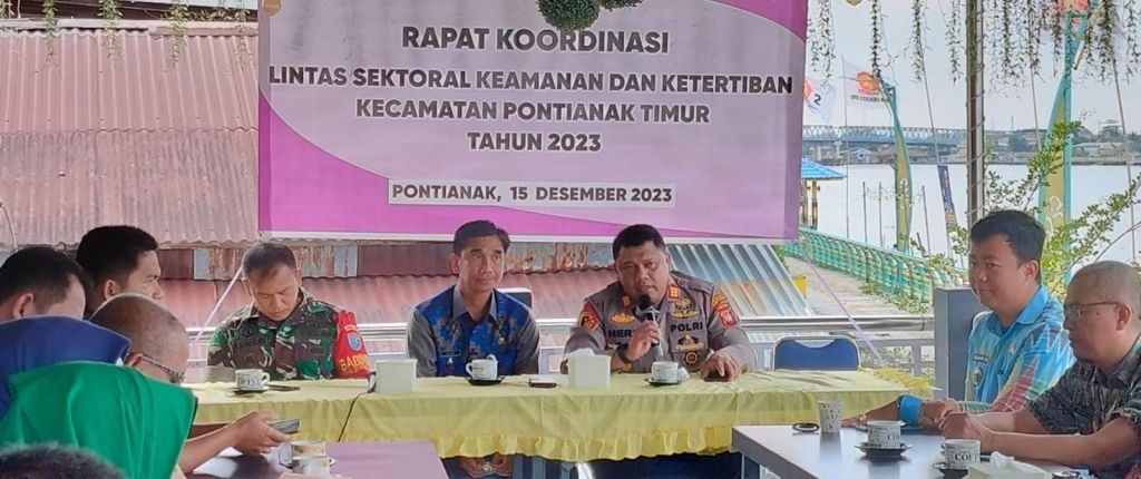 Pada hari Jumat tanggal 15 Desember 2023 Pukul 08.30 Wib bertempat di Cafe Pondok Kapuas Jl. Tepian Kapuas Kel. Tambelan Sampit Kec. Pontianak Timur telah dilaksanakan Kegiatan Rapat Koordinasi Lintas Sektoral Keamanan dan Ketertiban Kecamatan Pontianak Timur Sekaligus Kegiatan Jumat Curhat Polresta Pontianak.