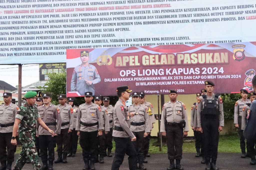 Dalam amanat Kapolda Kalbar yang dibacakan Kapolres Ketapang, apel gelar pasukan ini sebagai wujud final check atas kesiapan seluruh personel dan sarana dan prasarana yang terlibat dalam Operasi Liong Kapuas 2024 dan Pengamanan Pemilu 2024 sehingga diharapkan Perayaan Imlek Cap Go Meh dan Pemilu 2024 di Kalimantan Barat khususnya di Kabupaten Ketapang yang berlangsung beririsan dapat berjalan dengan aman dan lancar.
