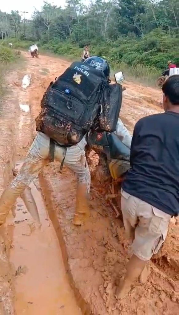 Kapolres Melawi AKBP Muhammad Syafi’i, S.I.K.,S.H.,M.H melalui Kasubsi Penmas Aipda Arbain Menyampaikan saat Personil Polres Melawi harus berkubang dengan lumpur Saat melewati akses jalan menuju Desa Manding dan Desa Natai Panjang, Kecamatan Pinoh Utara, Kabupaten Melawi, Kalimantan Barat.