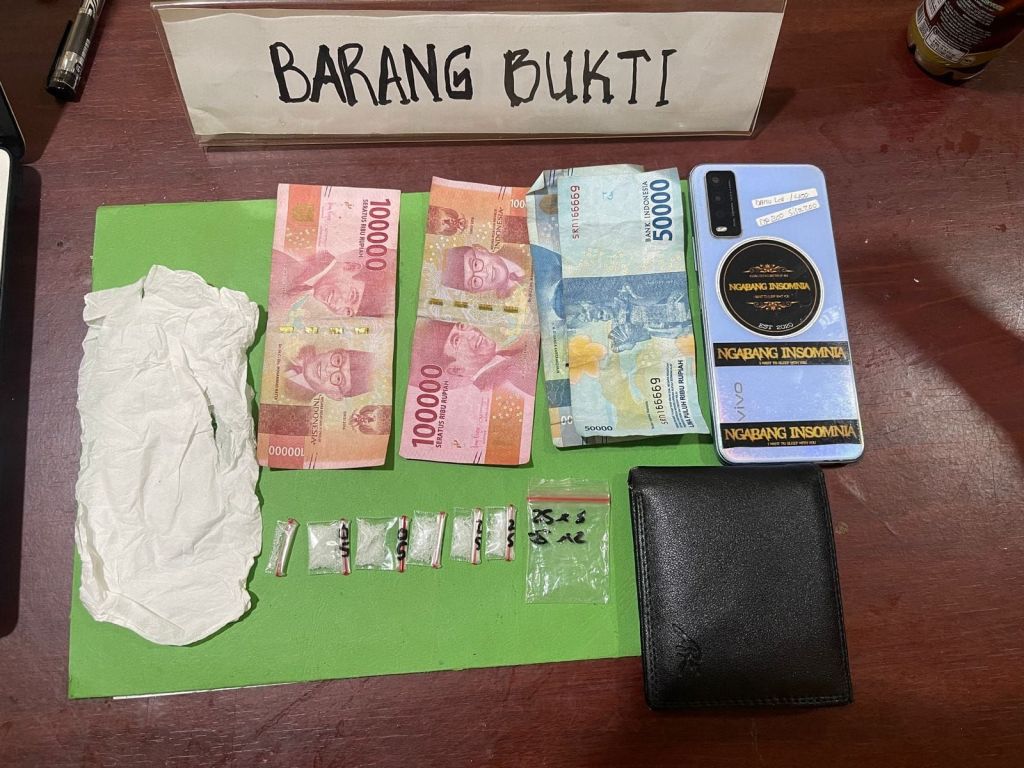 Saat penggeledahan tersebut ditemukan Barang Bukti (BB) berupa 1 buah dompet warna hitam yang berisikan 1 (satu) paket kristal diduga narkotika jenis sabu dari tangan Tersangka, 1 (satu) buah plastik klip transparan berisikan 5 (lima) paket kristal yang di balut dengan 1 (satu) lembar tisu, uang tunai sebesar Rp. 300.000, 1 (satu) unit sepeda motor merk Honda Scopy warna hitam tanpa nopol dengan Noka MHIJM0110NK538591 dan Nosin JMOIE1537458, dan 1 (satu) unit HP merk Vivo warna biru berikut sim card.