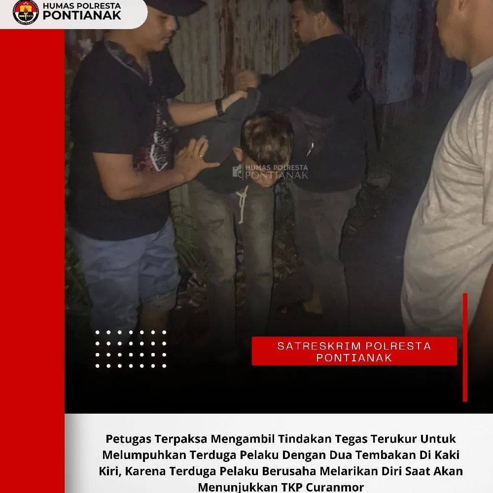 “Sekira pukul 04.45 WIB Satgas Curanmor berhasil melakukan penangkapan terhadap diduga pelaku a.n R dilokasi tersebut, namun saat terduga pelaku tersebut dibawa untuk menunjukan TKP, dia berusaha untuk melarikan diri dan akhirnya kami melakukan tindakan tegas terukur dengan melumpuhkan terduga pelaku dengan dua tembakan dikaki kiri”, ungkap Kompol Antonius.
