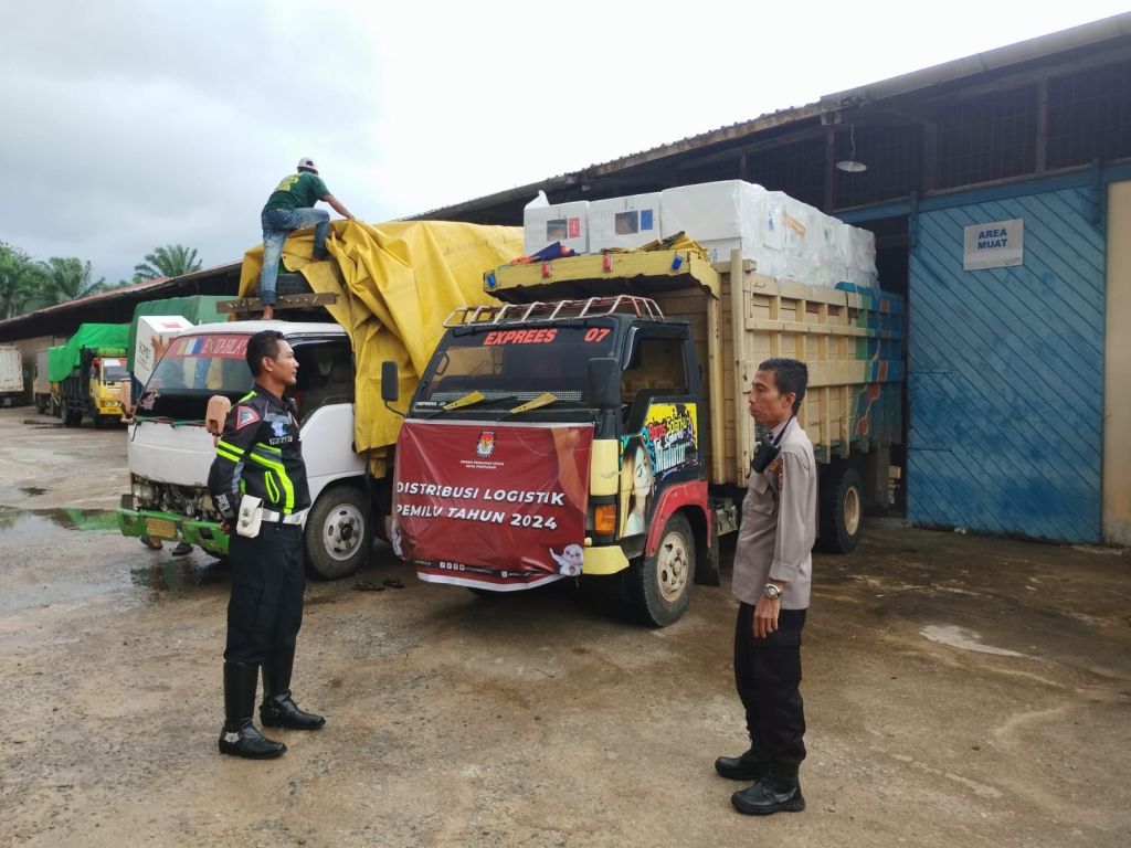Terlihat petugas kepolisian dari Polresta Pontianak bersiaga disekitar gudang KPU kota Pontianak dikomplek pergudangan Indomarco Jl. Komyos Soedarso Pontianak Barat, sabtu (2/3/2024).
