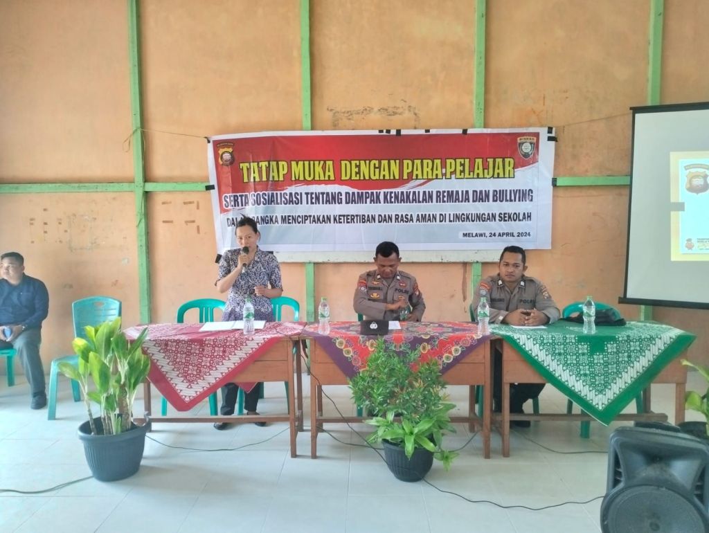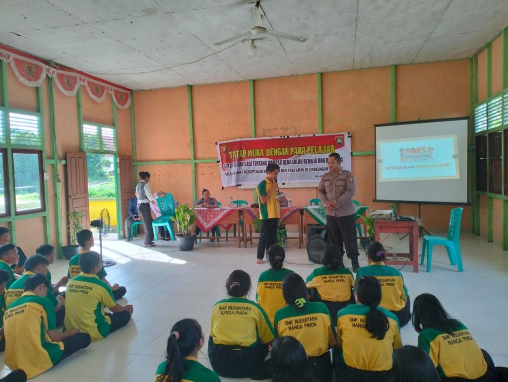 Polres Melawi Polda Kalbar – Polres Melawi melaksanakan kegiatan Tatap Muka yang bertujuan untuk memberikan sosialisasi tentang Dampak Kenakalan Remaja dan Bahaya Bullying, demi menciptakan lingkungan sekolah yang lebih aman dan teratur. Kegiatan dilaksanakan di SMK Nusantara Kec Nanga Pinoh. Kamis (25/4) Acara tersebut dihadiri oleh para dewan guru dan siswa-siswi SMK Nusantara Kecamatan Nanga Pinoh,