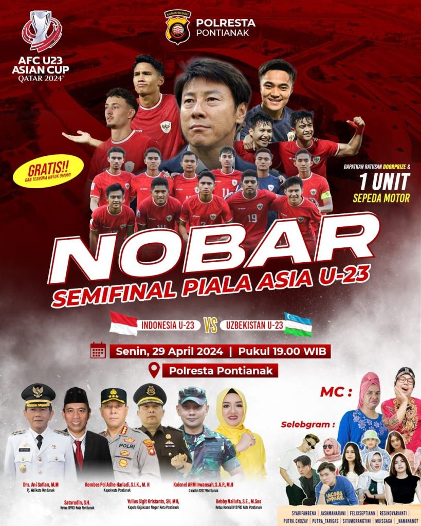 Untuk mendukung Timnas Indonesia yang akan bertanding malam ini kami Polresta Pontianak menyelenggarakan nonton bareng,kami mengundang masyarakat yang hobi sepak bola untuk hadir menyaksikan laga semi final AFC U23 dihalaman Polresta Pontianak Jl. Johan Idrus Pontianak selatan.” Kata Kapolresta Pontianak Kombes Pol Adhe Hariadi, S.I.K, MH.