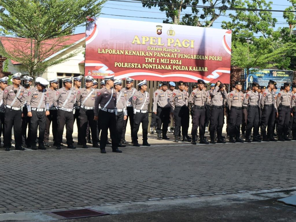 Pontianak,Polda Kalbar – Dua personel Polresta Pontianak menerima kenaikan pangkat pengabdian terhitung tanggal 1 Mei 2024 dilapangan apel Polresta Pontianak Jl. Johan Idrus, Rabu (1/5/2024) pagi.