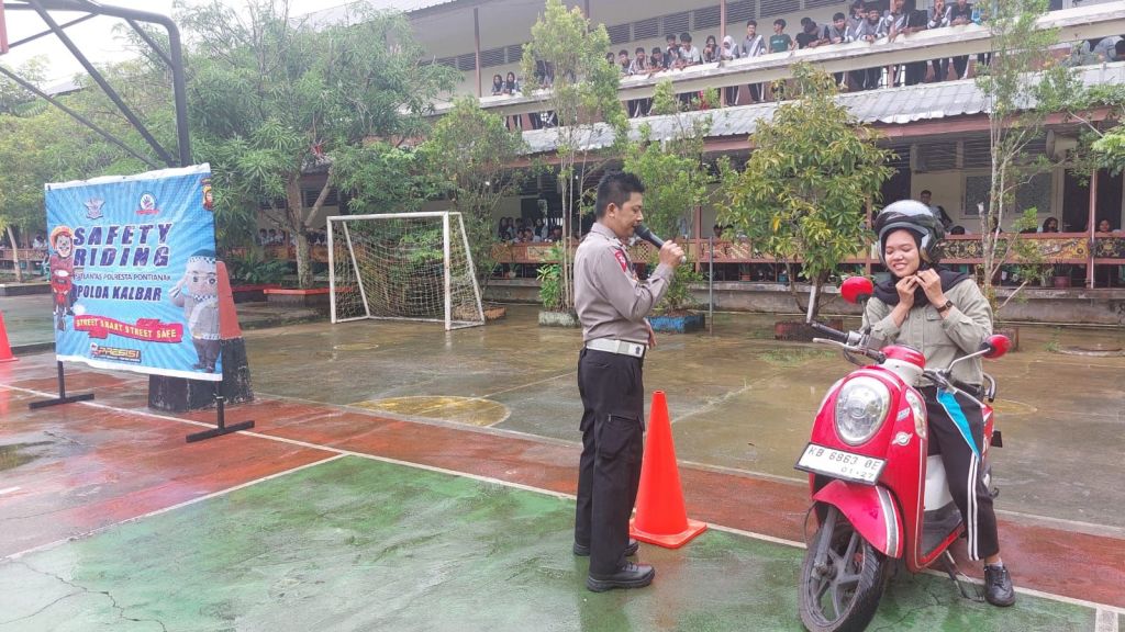 Pontianak, Polda Kalbar 24 Mei 2024 – Satuan Lalu Lintas (Sat Lantas) Polresta Pontianak menyelenggarakan kegiatan penyuluhan safety riding bagi pelajar SMA Negeri 4 Pontiana. Kegiatan ini dipimpin oleh Kanit Kamseltibcarlantas Sat Lantas Polresta Pontianak, AKP Edy Karnadi, dan timnya.