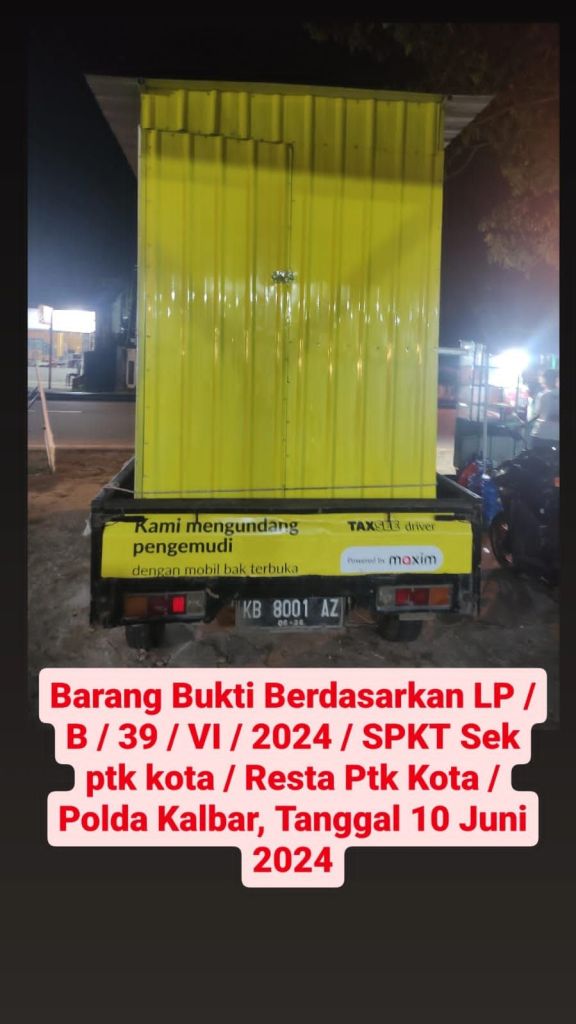 Hal ini bermula saat AF (28) warga Jl. Gusti Hamzah Gang Pancasila I RT. 005 RW. 011 Kecamatan Pontianak Kota, melaporkan telah kehilangan 1 (satu) buah gerobak container warna kuning, pada hari Kamis (6/6/24) sekitar pukul 01.00 WIB, ke Polsek Pontianak Kota.