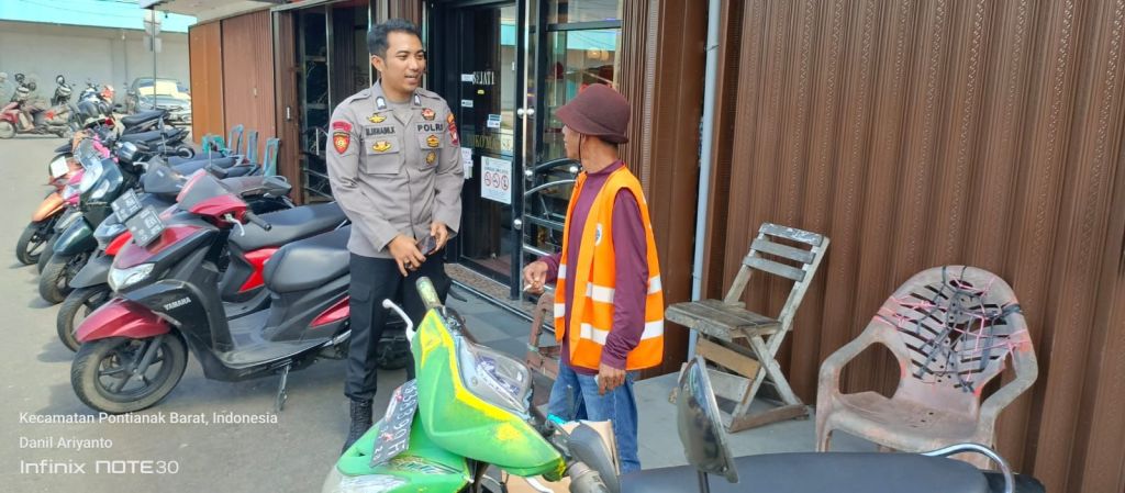 Pontianak, Polda Kalbar – Polresta Pontianak, Pontianak Barat. Personil Enggang Polsek Pontianak Barat melaksanakan himbauan kamtibmas kepada juru parkir dan warga setempat dalam rangka mengantisipasi potensi gangguan kamtibmas. Kegiatan ini dilaksanakan di beberapa lokasi parkiran dan pertokoan di sekitar Pasar Dahlia Kec. Pontianak Barat. Kamis (13/6/2024).
