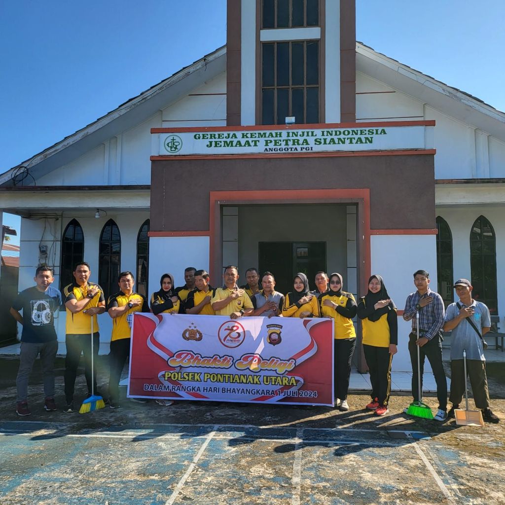 Pontianak,Polda Kalbar – Masih dalam rangkaian menyambut Hut Bhayangkara ke-78 tahun 2024 Polsek Pontianak Utara kembali melaksanakan Bhakti sosial yang dikemas dalam Bhakti religi yang dilaksanakan digeteja GKII Jemaat Petra Jl. Budi Utomo Pontianak Utara, Sabtu (15/6/2024) pagi.