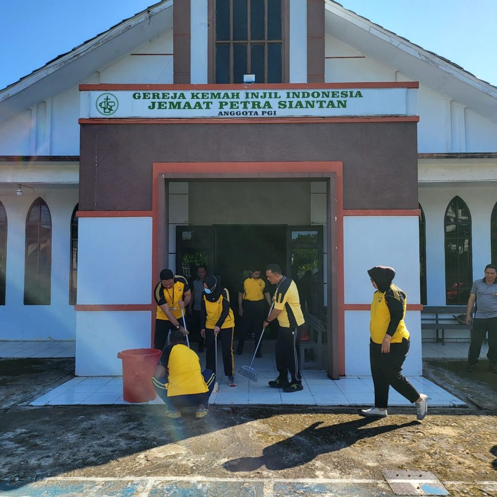 Kapolsek Pontianak Utara AKP Suryadi, SH, M.Ap bersama anggotanya dengan membawa peralatan kebersihan membersihkan lingkungan gereja mulai dari ruangan tempat ibadah hingga halaman depan dan sekitar bangunan gereja.