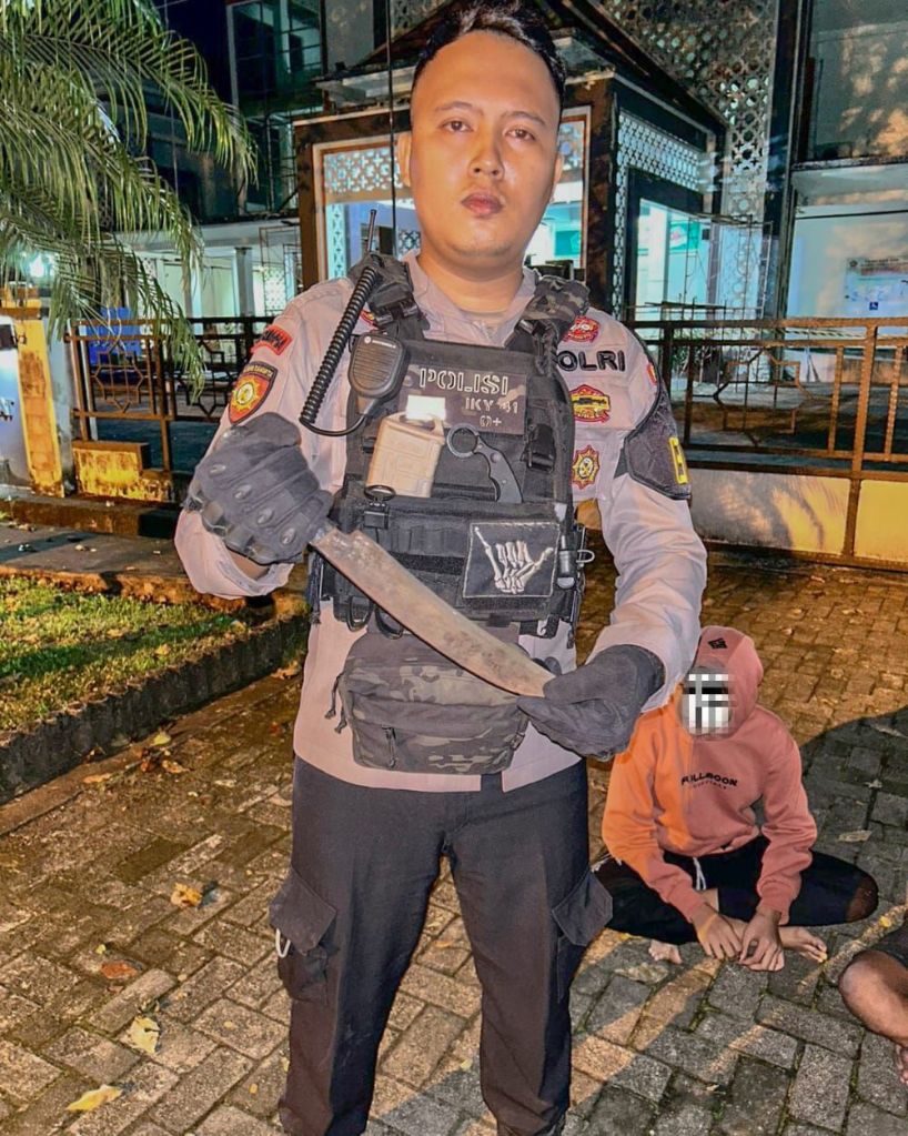 “Saat itu kami melaksanakan patroli rutin dan melihat mereka bertiga menggunakan satu motor, kemudian kami lakukan pemeriksaan dan didapatkan barang bukti berupa sajam jenis pisau yang dilemparkan oleh pelaku pada saat diberhentikan”, ungkap Resky