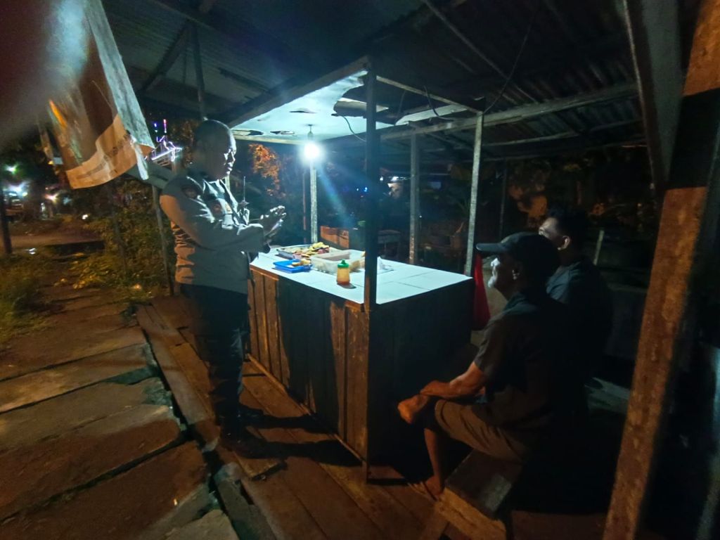 Pontianak, Polda Kalbar – Polresta Pontianak, Pontianak Barat. Personel Enggang Polsek Pontianak Barat menggelar patroli malam untuk memberikan himbauan kamtibmas kepada warga yang sedang beraktivitas. Patroli ini bertujuan untuk mengantisipasi tindak kejahatan seperti curi, curat, curas, dan curanmor (4C). Senin 24/6/2024 malam.