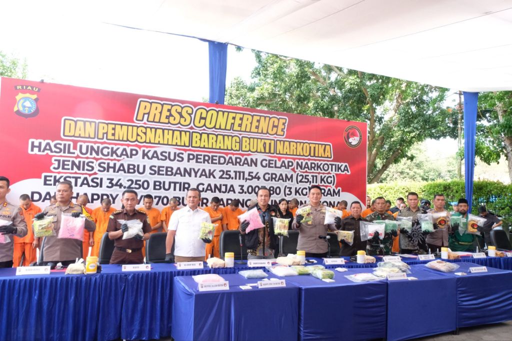 Riau. Dit Narkoba Polda Riau berhasil menggagalkan peredaran gelap narkoba jenis sabu sebanyak 25 Kg dan 34.000 pil ekstasi selama dua bulan terakhir. Seluruh barang haram itu pun dimusnahkan pada 12 Juli 2024.