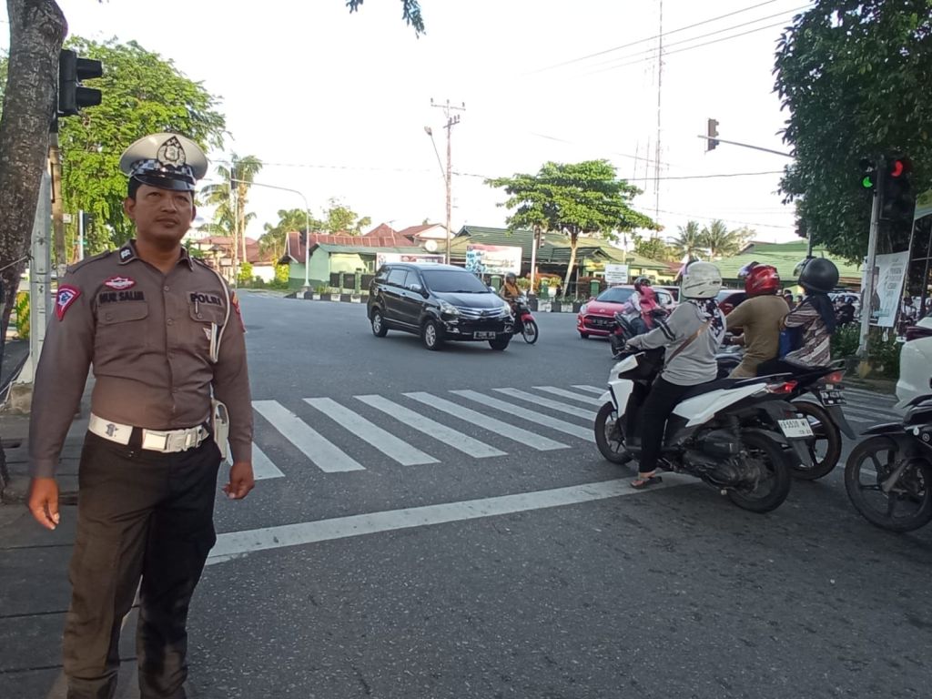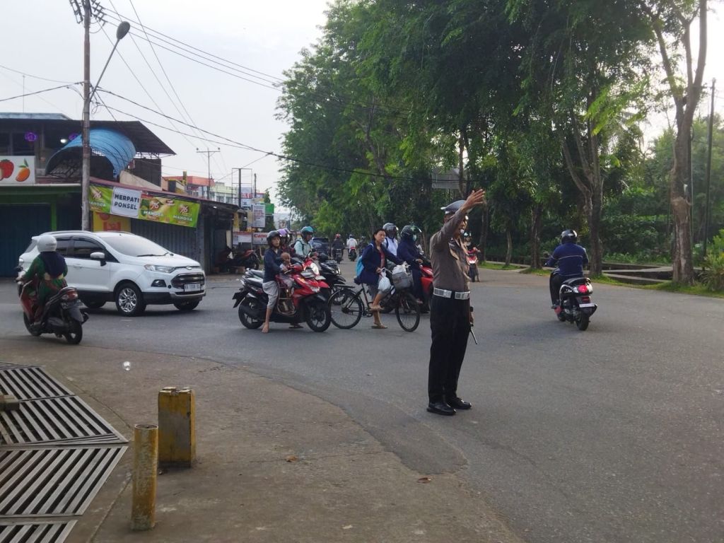 Personil polsek kota melakuka Pengaturan Lalu-lintas Di Pagi Hari Memberikan Pelayanan Kepada Masyarakat Pengguna Jalan Dan Pelajar