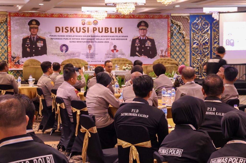 PONTIANAK, KALBAR – Kapolda Kalbar Irjen Pol Pipit Rismanto S.IK, M.H yang diwakili Kepala Bidang Humas Polda Kalimantan Barat Kombes Pol Raden Petit Wijaya, S.I.K., M.M. membuka acara Diskusi Keterbukaan Informasi publik yang juga dihadiri oleh Kabag Yaninfodok Divhumas Polri Kombes Pol. Komang Sutrasba, S.I.K., S.H., M.H., di Hotel Grand Mahkota Pontianak, Kamis (29/8).