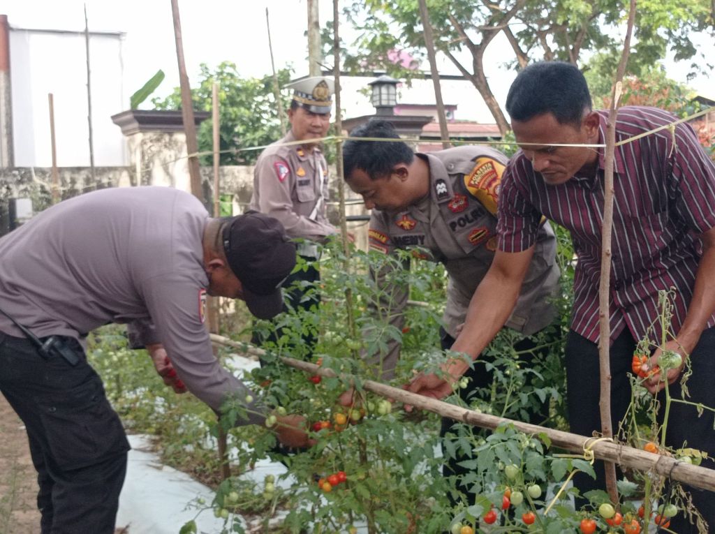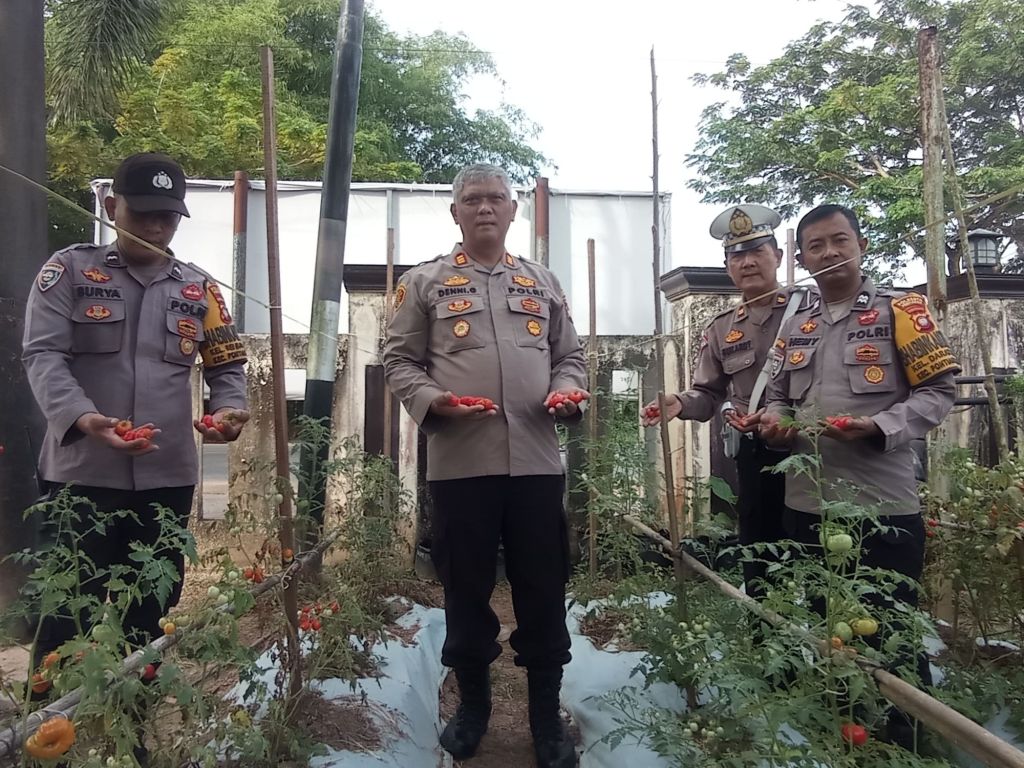 Dengan penuh semangat, AKP Denni Gumilar memimpin langsung kegiatan panen, Tomat-tomat segar yang merah ranum dipetik dari kebun sederhana yang dirawat dengan telaten oleh anggota Polsek.