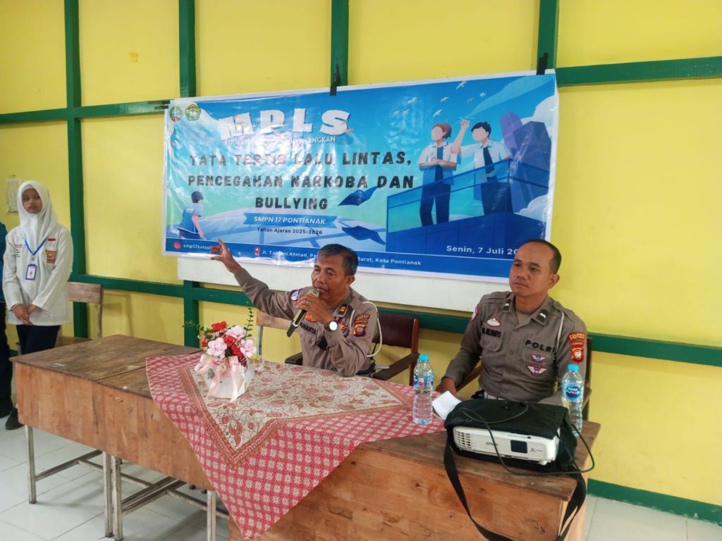 Pontianak – Dalam rangka Masa Pengenalan Lingkungan Sekolah tahun ajaran baru tahun 2025, Kanit Lantas Polsek Pontianak Barat Iptu Sunanta bersama Aipda Tri Julianto melaksanakan kegiatan penyuluhan dan sosialisasi kepada para siswa-siswi SMP Negeri 17 Pontianak, Senin (7/7).