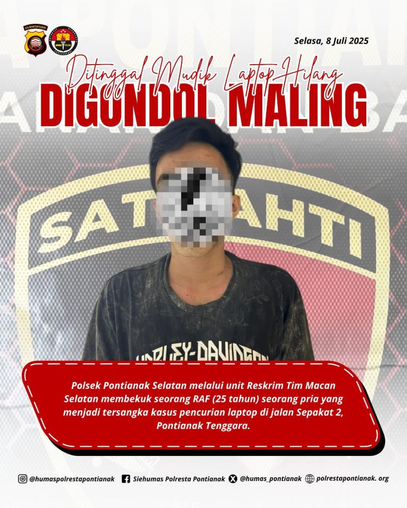 Polresta Pontianak, Polda Kalbar – Polsek Selatan melalui unit Reskrim Tim Macan Selatan membekuk seorang RAF (25 tahun) seorang pria yang menjadi tersangka kasus pencurian laptop di jalan Sepakat 2, Pontianak Tenggara.