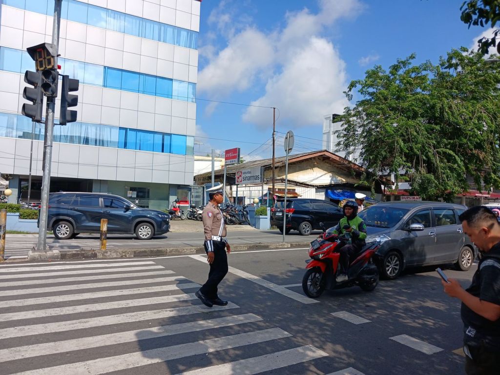 Kegiatan kali ini berlangsung di persimpangan lampu merah Pasar Flamboyan, salah satu titik strategis dengan volume kendaraan yang tinggi.