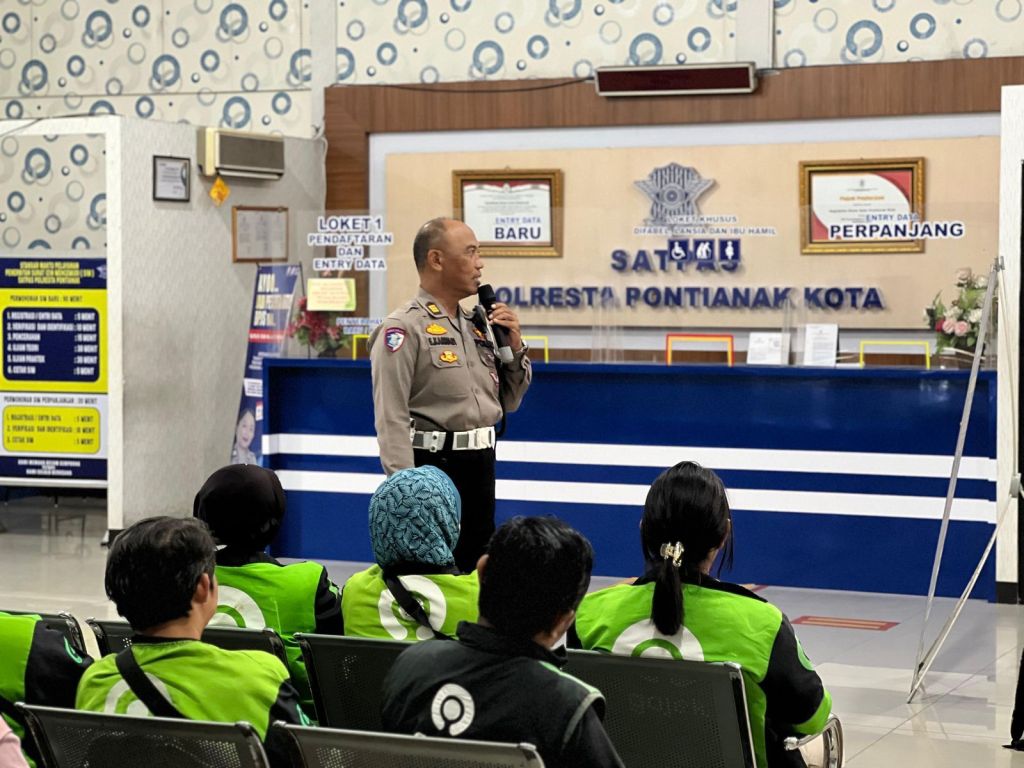 Pontianak, Polda Kalbar — (4/8/2025) Satuan Lalu Lintas (Sat Lantas) Polresta Pontianak kembali menggelar kegiatan penyuluhan tertib berlalu lintas kepada para driver ojek online (Ojol) yang berlangsung di Satuan Penyelenggara Administrasi SIM (Satpas) Polresta Pontianak, Jalan RE Martadinata, Sabtu siang (2/8).
