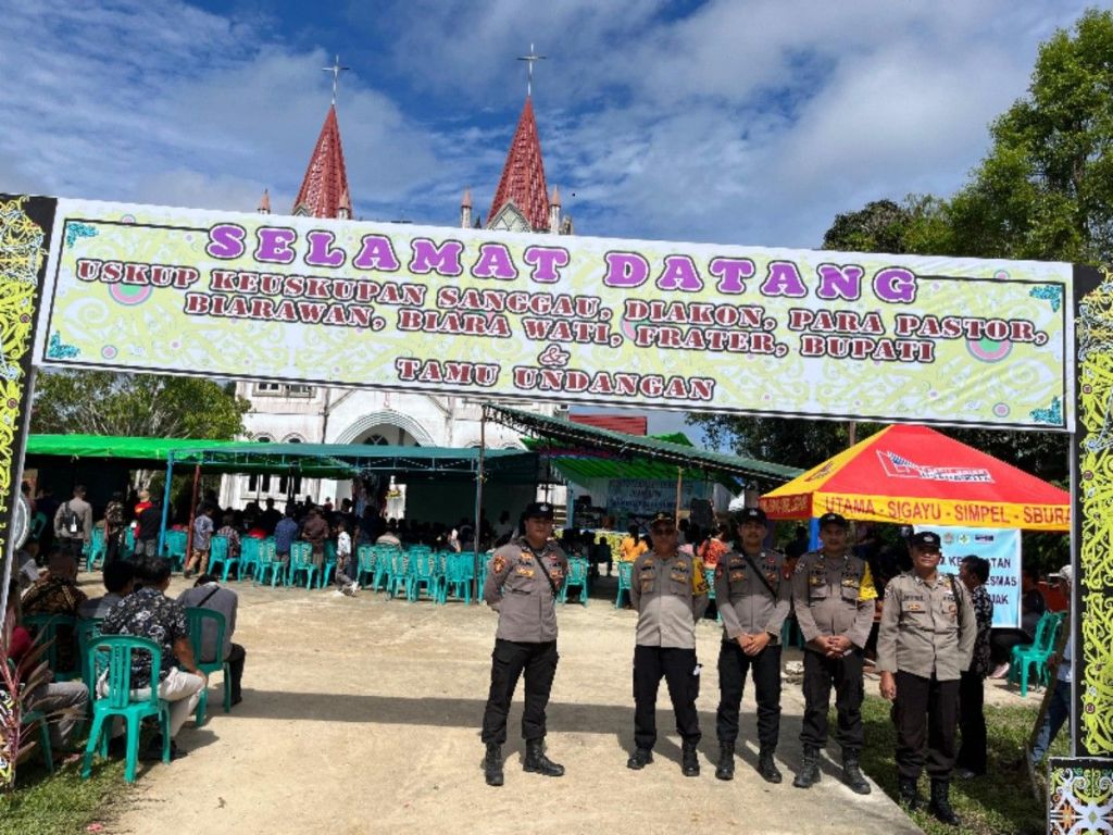 SEKADAU, Polda kalbar – Puluhan personel Polres Sekadau dikerahkan untuk mengamankan kegiatan pentahbisan Pastor Diakon Philipus Gunung di Gereja Kemuliaan Tuhan, Paroki Yesus Tersalib, Desa Balai Sepuak, Kecamatan Belitang Hulu, Kabupaten Sekadau, Selasa (5/8/2025).