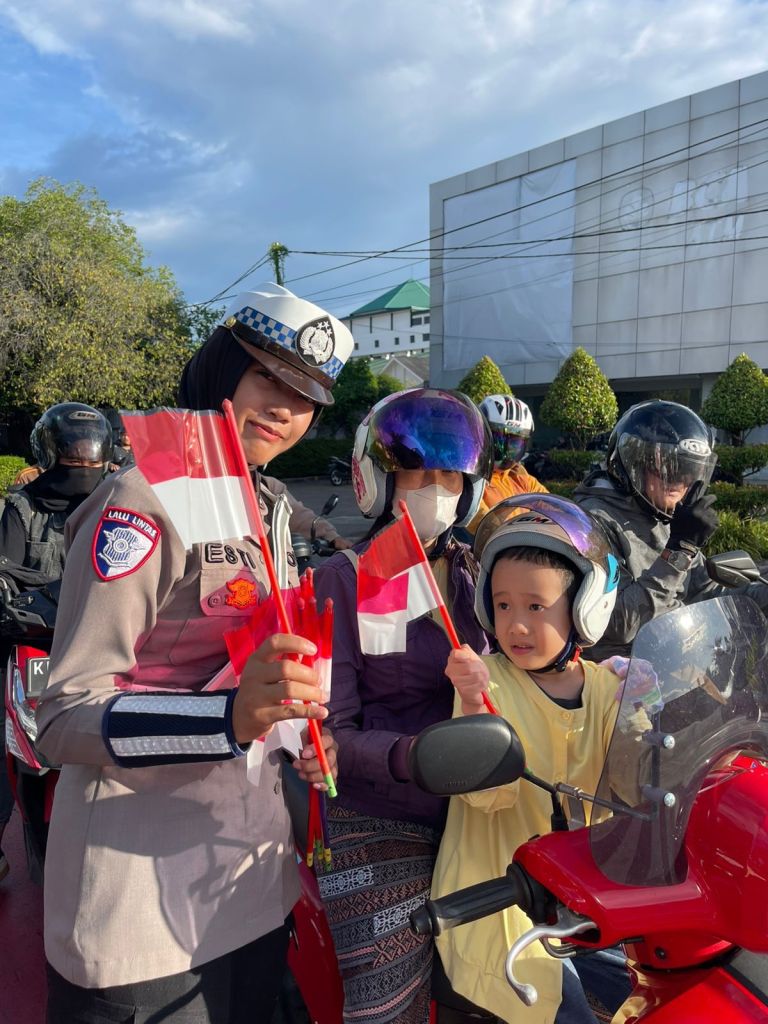 Selain membagikan bendera, petugas Sat Lantas juga memberikan imbauan kepada pengendara agar selalu tertib berlalu lintas, mematuhi rambu-rambu, dan melengkapi surat-surat kendaraan demi keselamatan bersama.