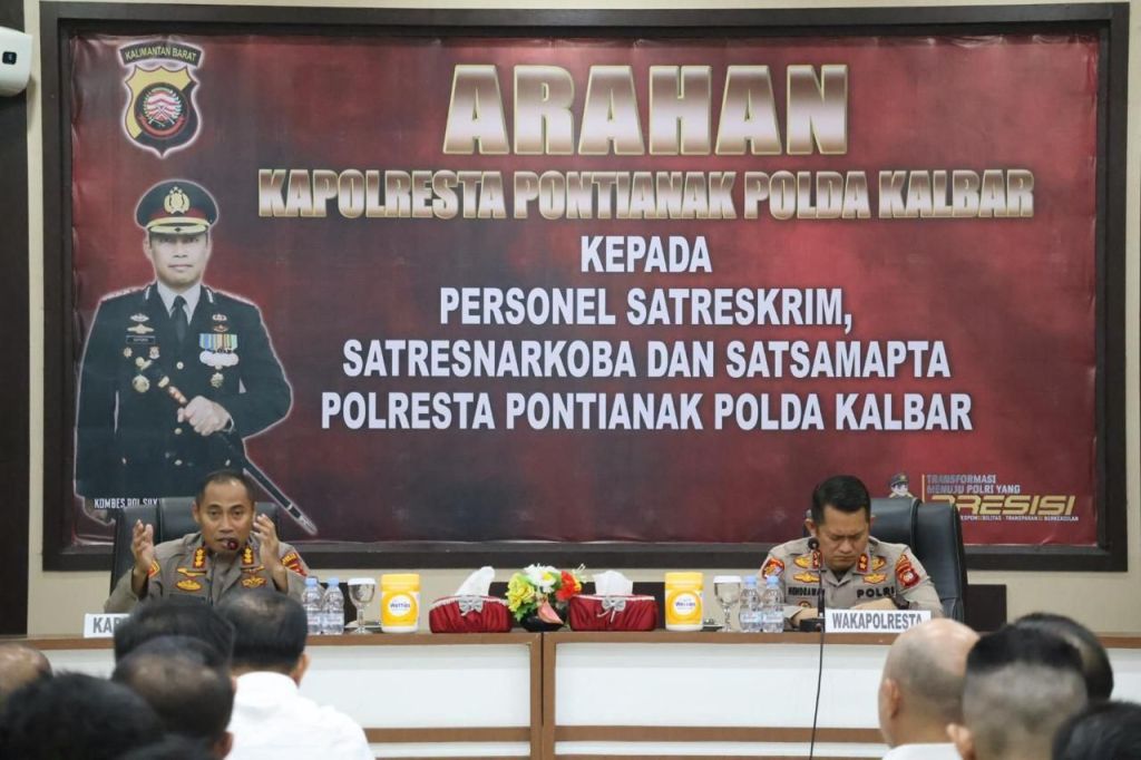 Pontianak, Polda Kalbar – Kapolresta Pontianak Kombes Pol Suyono, S.I.K., S.H., M.H., memberikan arahan langsung kepada personel Satuan Reserse Kriminal (Sat Reskrim), Satuan Reserse Narkoba (Sat Resnarkoba), dan Satuan Samapta di Aula Polresta Pontianak, Sabtu pagi (9/8/2025).