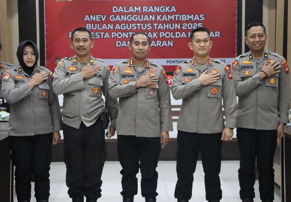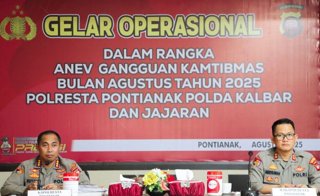 Pontianak, Polda Kalbar – Kapolresta Pontianak Kombes Pol Suyono, S.I.K., S.H., M.H. memimpin langsung kegiatan Gelar Operasional (GO) dalam rangka analisa dan evaluasi (Anev) gangguan Kamtibmas bulan Agustus 2025.