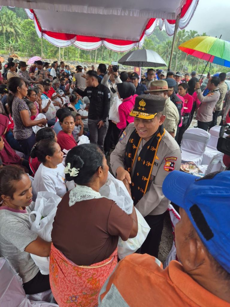 Nagekeo, NTT – Bantuan kemanusiaan dari Kepolisian Negara Republik Indonesia (Polri) untuk korban banjir bandang dan tanah longsor di Kecamatan Mauponggo, Kabupaten Nagekeo, Nusa Tenggara Timur (NTT), telah tiba dan disambut dengan penuh haru dan antusias oleh masyarakat setempat serta Pemerintah Kabupaten Nagekeo. Bencana yang melanda pada Sabtu, 13 September 2025 tersebut mengakibatkan dampak kerusakan parah, dengan korban meninggal dunia 5 orang, hilang 3 orang, luka berat 6 orang, dan luka ringan 11 orang. Selain itu, sebanyak 37 kepala keluarga harus mengungsi akibat rumah mereka mengalami kerusakan, disertai kerusakan pada 66 bidang lahan sawah dan kebun, 16 ruas jalan, 6 jembatan, 5 titik irigasi, serta terputusnya jaringan listrik dan air bersih.