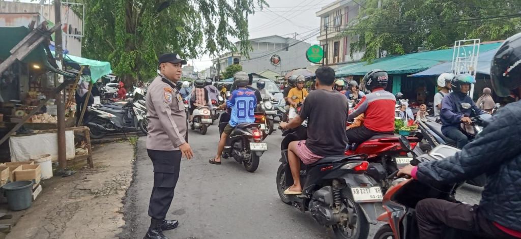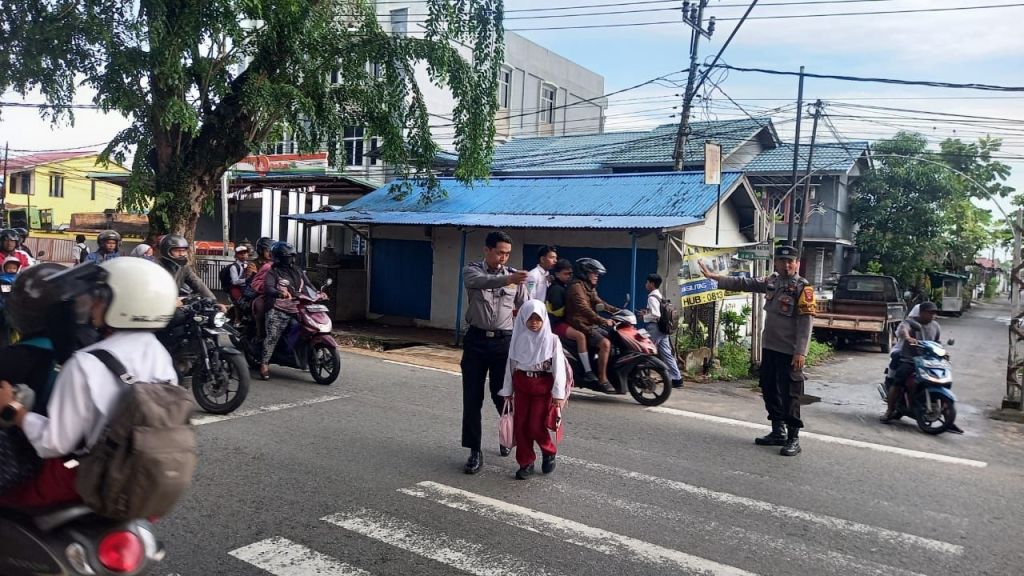 Bhabinkamtibmas turun langsung mengatur arus kendaraan, membantu anak-anak menyeberang jalan, serta memberikan imbauan kepada orang tua dan pengendara agar tertib berlalu lintas.