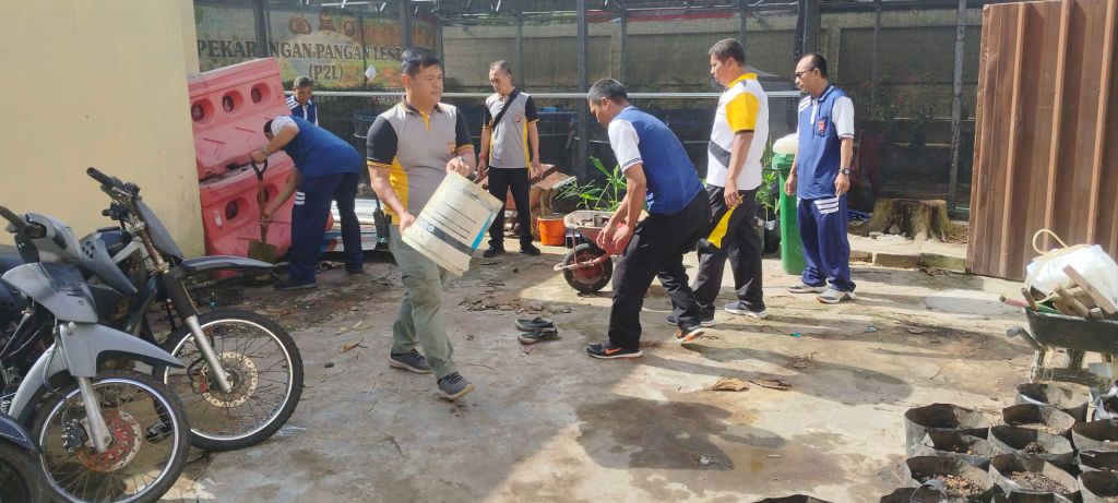 Kegiatan dimulai dengan apel pagi yang dipimpin langsung oleh Kapolsek sebagai bentuk kedisiplinan dan pengecekan kesiapan personel. Dalam arahannya, AKP Tarminto menekankan pentingnya menjaga kebersihan lingkungan kerja sebagai wujud kedisiplinan dan tanggung jawab bersama.