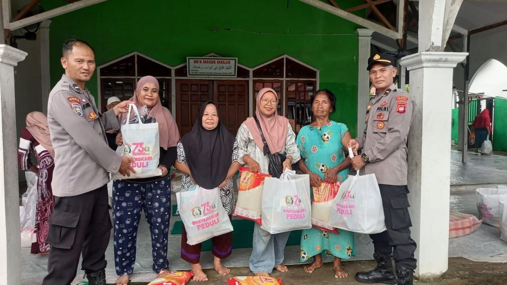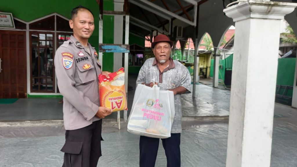 Dalam kegiatan tersebut, bantuan berupa paket sembako dan beras diserahkan secara langsung kepada warga di sekitar lingkungan masjid. Penyaluran ini merupakan bentuk kepedulian sosial Bhayangkari dalam rangka membantu meringankan beban masyarakat serta mempererat hubungan antara Polri dan warga.