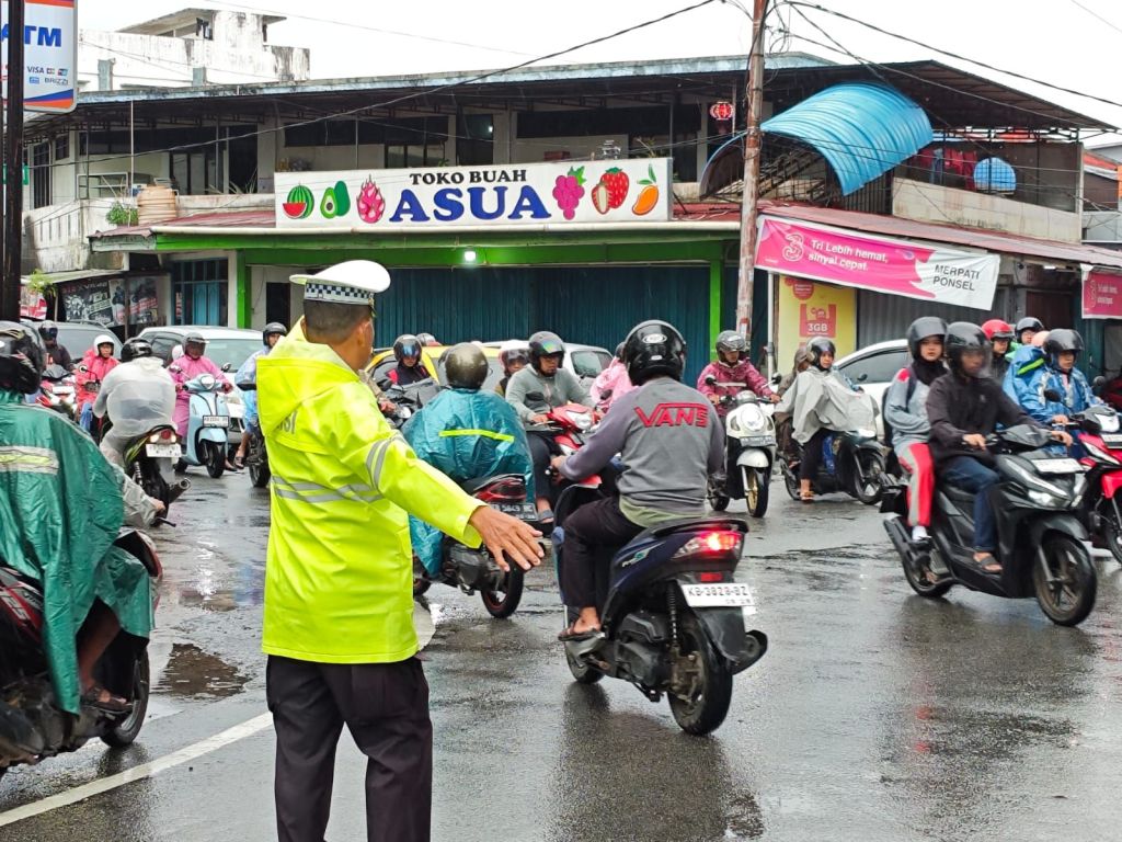 Pontianak, Polda Kalbar,– Meskipun cuaca diguyur hujan, personel Polsek Pontianak Kota tetap melaksanakan kegiatan pengaturan arus lalu lintas (Gatur Lalin) di wilayah hukumnya pada Selasa pagi (21/10).