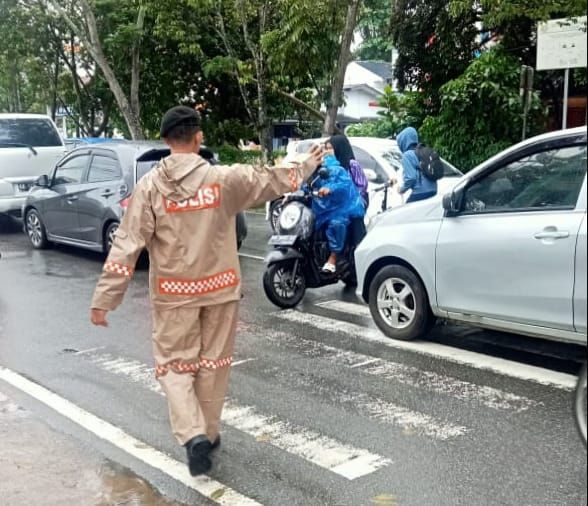 Meskipun dalam kondisi hujan, personel tetap hadir di lapangan dengan penuh semangat dan tanggung jawab untuk memastikan arus kendaraan berjalan lancar dan tertib.