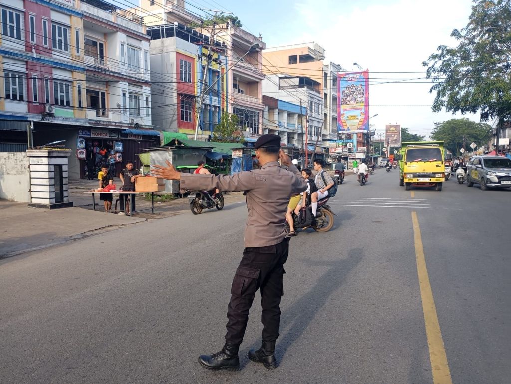 PONTIANAK,KALBAR – Untuk membantu kelancaran arus lalulintas dijam aktivitas masuk sekolah, patroli enggang Polsek Pontianak Utara lakukan pengaturan lalulintas didepan sekolah. Rabu (29/10/2025). Pagi.