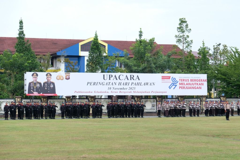 Pontianak – Kepolisian Daerah Kalimantan Barat menggelar Upacara Peringatan Hari Pahlawan Nasional Tahun 2025 dengan khidmat di Lapangan Jananuraga Polda Kalbar. (Senin, 10/11/2025)