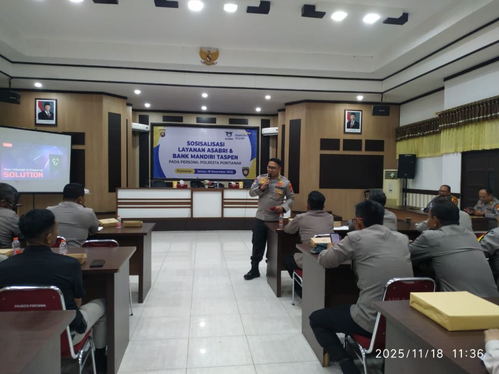 PONTIANAK, Polda Kalbar – (19/11) Polresta Pontianak menggelar kegiatan sosialisasi layanan Asabri dan Bank Mandiri Taspen bagi personel yang memasuki masa persiapan pensiun, khususnya anggota dengan tahun kelahiran 1968 dan 1969.