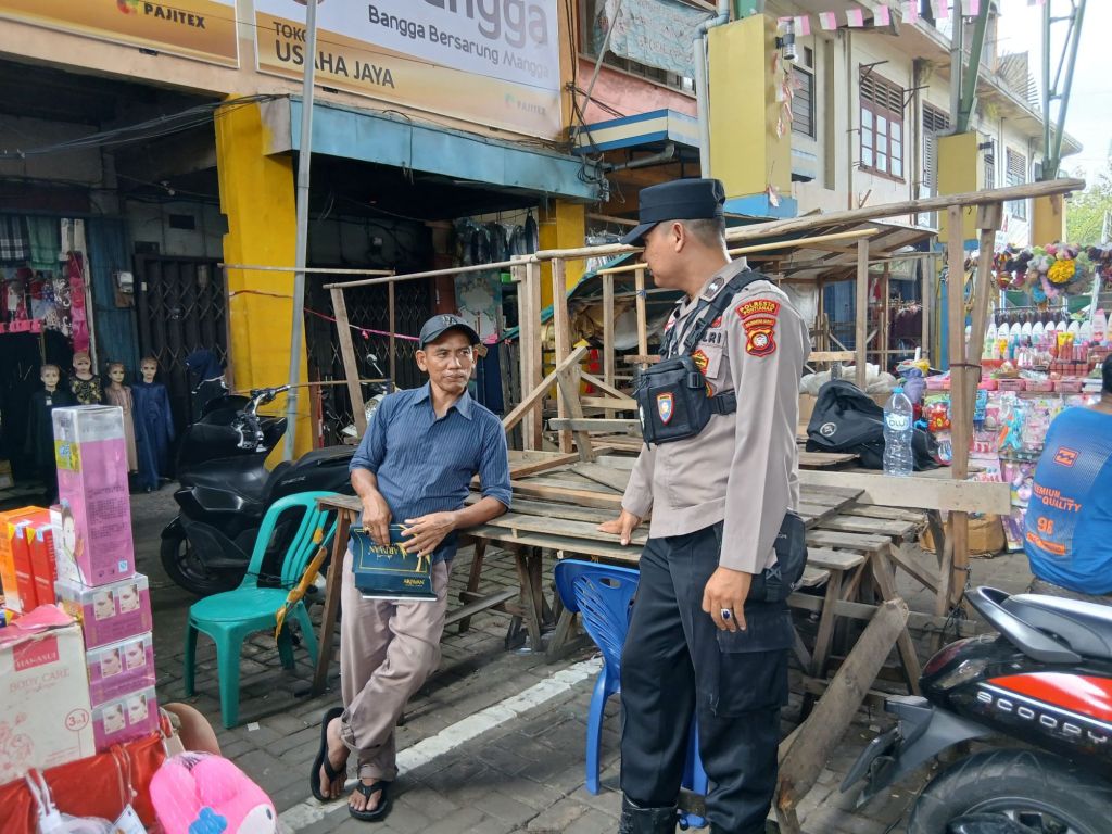 Pontianak, Polda Kalbar – Personel Pos Polisi Serayu Polsek Pontianak Kota, Aipda Kurniawan, melaksanakan kegiatan sambang sekaligus menyampaikan himbauan Kamtibmas kepada para pedagang dan pengunjung Pasar Tengah, Jalan Asahan, pada Jumat (21/11/2025).