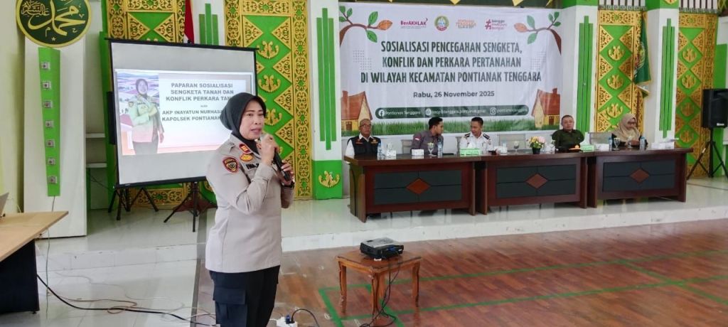 Pontianak Tenggara, Polda Kalbar — 27 November 2025. Kapolsek Pontianak Selatan AKP Inayatun Nurhasanah, S.H., menghadiri sekaligus menjadi narasumber dalam kegiatan Sosialisasi Pencegahan Sengketa, Konflik, dan Perkara Pertanahan yang digelar di Aula Kantor Camat Pontianak Tenggara pada pukul 08.30 WIB.