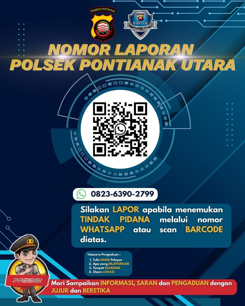 Menurut keterangan Kapolsek Pontianak utara Kompol I Made Aris Candra Putra S.I.K Mengatakan, selain Hotline Polri 110 kami menyediakan nomor aplikasi Whatsap 082363902799 yang setiap saat dapat dihubungi oleh masyarakat untuk melaporkan,menginformasikan kejadian tindak pidana atau gangguan kamtibmas lainnya diwilayah Pontianak utara